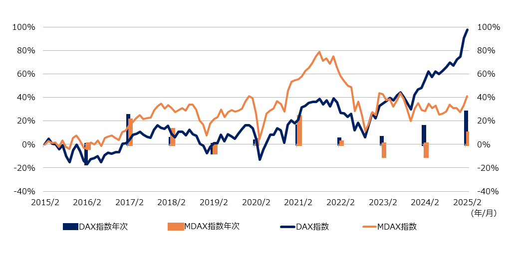 過去10年間のDAX指数とMDAX指数のパフォーマンス