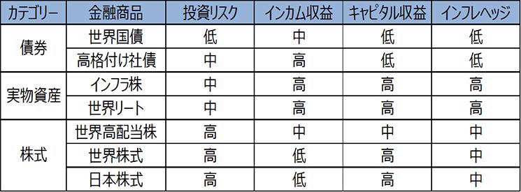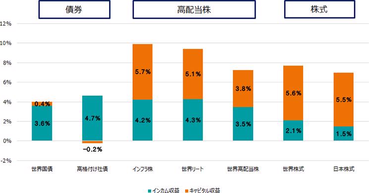 現状では、世界国債や高格付け社債については、キャピタル収益はほとんど期待できない一方で、インカム収益が収益の大部分を占めることで、非常に安定した投資収益が期待されます。また、世界株式や日本株式については、インカム収益が小さい一方で、キャピタル収益の割合が大きく、値上がり益を期待するような投資手法と言えるでしょう。そして、インフラ株や世界リート、世界高配当株についてはインカム収益とキャピタル収益のバランスが取れており、安定的なインカム収益とキャピタル収益の両方を狙える投資手法となります。