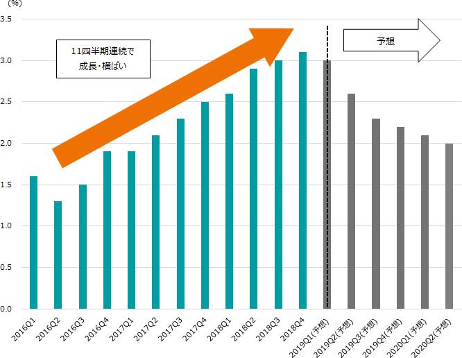 ここ数年間の経済成長は著しく、株式市場にとっては非常に強い追い風が吹く相場環境でした。米国GDP成長率(前年比)は2018年10-12月期まで11四半期連続で加速もしくは横ばいとなり、これは、統計上遡れる70年以上の歴史の中で初めてのことでした(図3)。こういった史上稀に見る好調な経済環境を背景に、過去2-3年については特に成長株が上昇してきました。