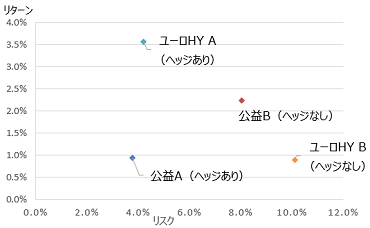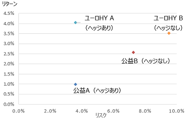また、「DWS ユーロ・ハイ・イールド債券ファンド」は、主に企業の信用力を表す格付けBB格相当以下で、相対的に高い利回りを持つ欧州で発行される社債(ハイ・イールド社債)を投資対象としています。ハイ・イールド債券は、企業が倒産・債務不履行(デフォルト)してしまう懸念やリスク等が通常の投資適格債券と比べると高いと考えられる一方で、相対的に高い利回りが設定されていますので、「すこし攻めた運用」が可能なファンドと言えます。もっとも、当ファンドの運用チームは豊富な投資経験を持ち、明確な投資アプローチと透明性の高い投資判断プロセスの基で運用を行なっており、リスク・リターンで見ますと「ヘッジありコース」では優れた結果が出ています。(図5)