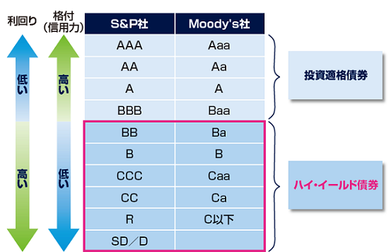 ハイ・イールド債券とは一般的にS&P社においてはBB格相当以下、Moody’s社においてはBa格相当以下の格付を付与されている高利回り社債のことを指します。「投資適格債券と比べて、信用力が低く債務不履行(デフォルト)に陥る可能性が高い」と評価されている分、その見返りとして、満期償還までの期間が同じ投資適格債券よりも、一般に高い利回りで発行・取引されています。