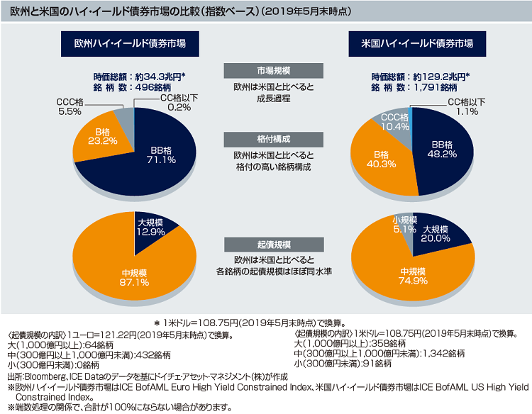 欧州ハイ・イールド債券市場の規模は、2008年のリーマン・ショック後大きく落ち込みましたが、2009年以降回復し、拡大傾向で推移してきました。 2019年5月末時点で、その規模は約3,152億米ドル、約34.3兆円(1米ドル=108.75円で換算)となっています。