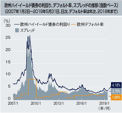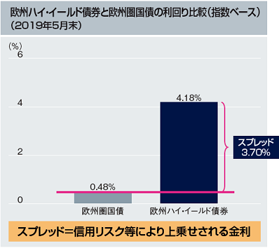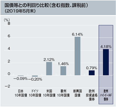 2019年5月末時点において、欧州ハイ・イールド債券の利回りは4.18%であり、日本10年国債の-0.09%や