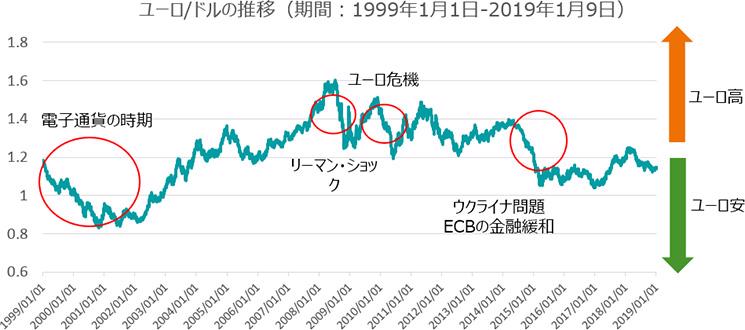 ユーロ導入後まもなくは、導入国間の経済格差が不安視され、ユーロ安となりました。しかしその後、世界的な好景気のなか、相対的に金利の高かったユーロへの需要が高まりました。