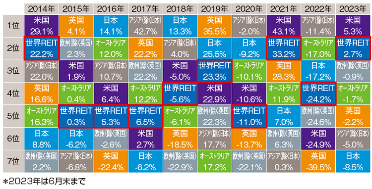 REITの値動きは、国・地域で異なる傾向があります。グローバルREITに投資を行うことで、分散投資効果が働き、相対的に安定したパフォーマンスが期待されます。