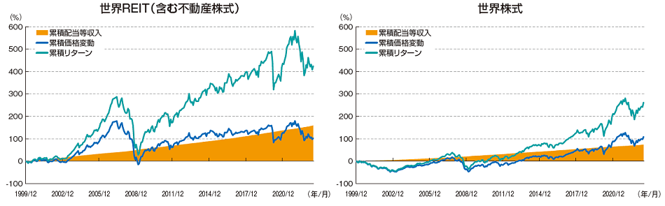 ◆世界REIT(含む不動産株式)と世界株式の累積リターンの内訳(指数、米ドルベース)